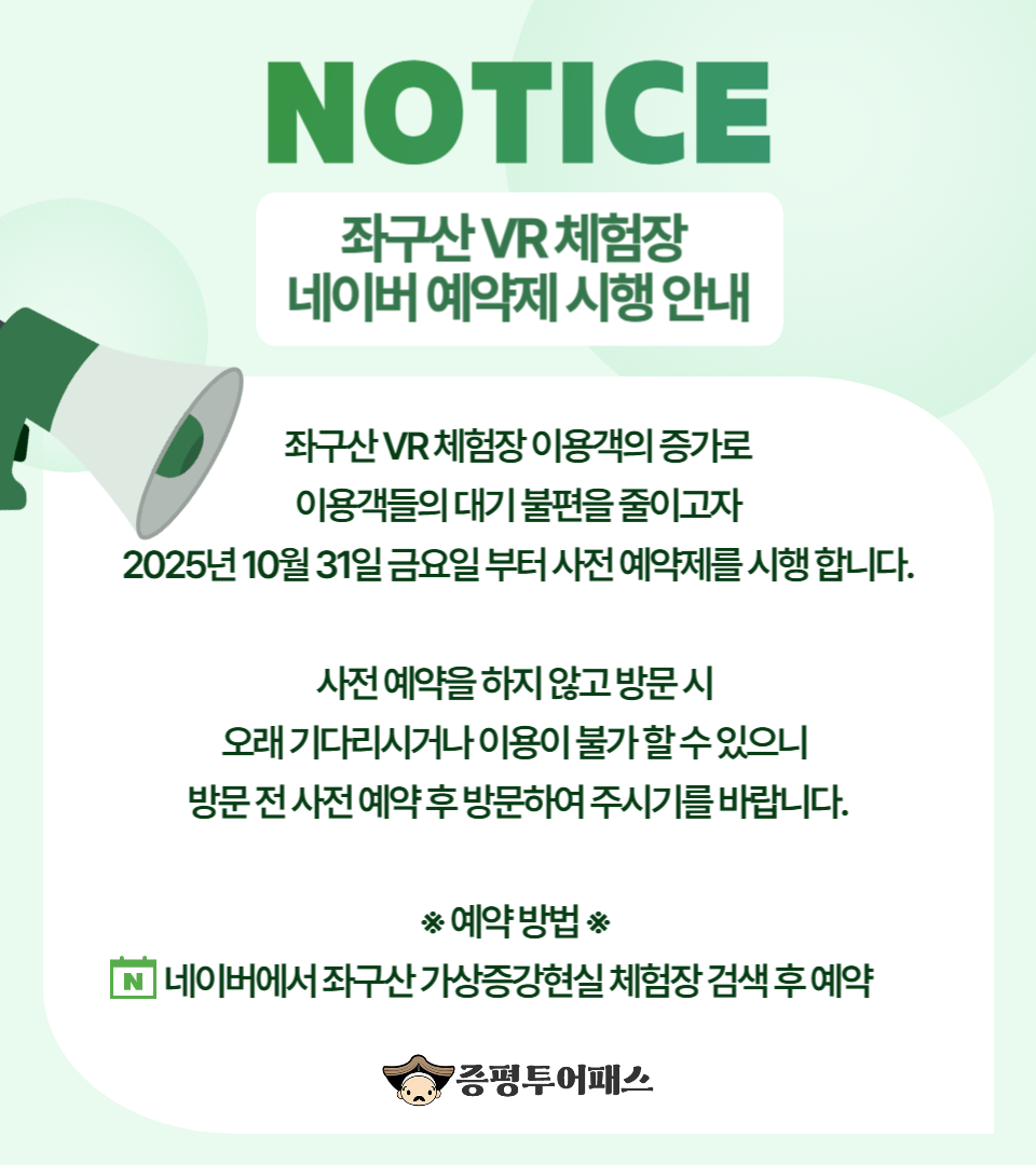 좌구산 VR 체험장 이용객 증가로 이용객분들의 대기 불편을 감소하고자 10/31(금)부터 사전 예약제를 시행합니다.